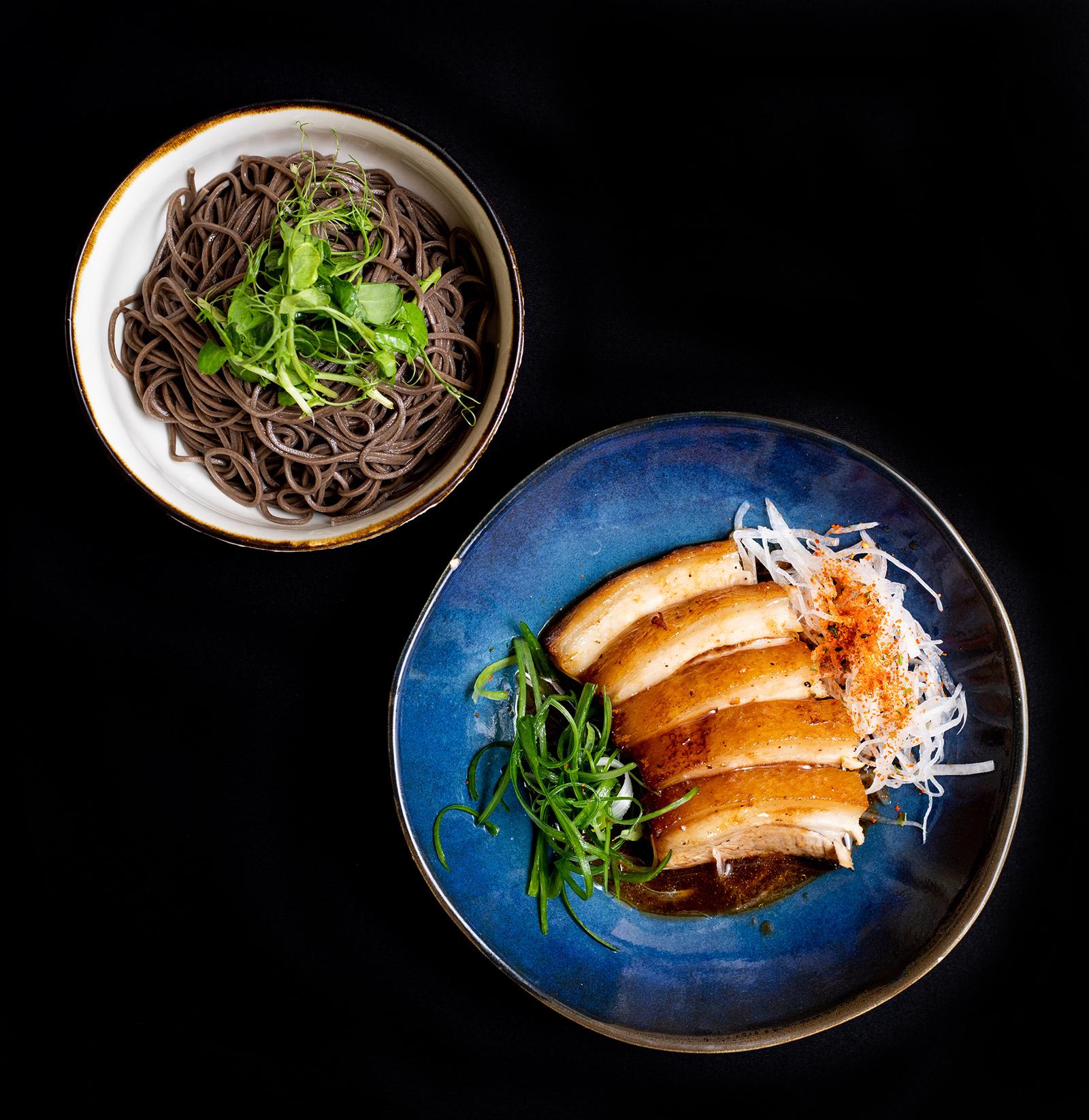 Soba nudle, japonský dušený bůček, tonkatsu omáčka, daikon, togarashi.